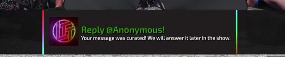 Anonymous reply Reply @Anonymous! Your message was curated! We will answer it later in the show. Timestamp