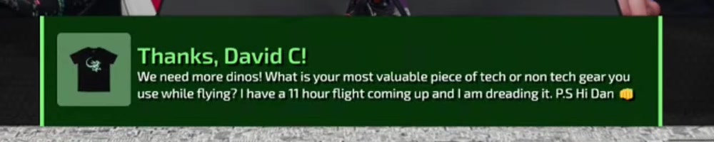 David C message Thanks, David C! We need more dinos! What is your most valuable piece of tech or non tech gear you use while flying? I have a 11 hour flight coming up and I am dreading it. P.S Hi Dan Timestamp