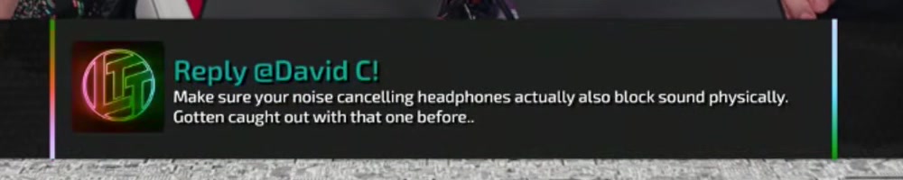 David C reply Reply @David C! Make sure your noise cancelling headphones actually also block sound physically. Gotten caught out with that one before.. Timestamp