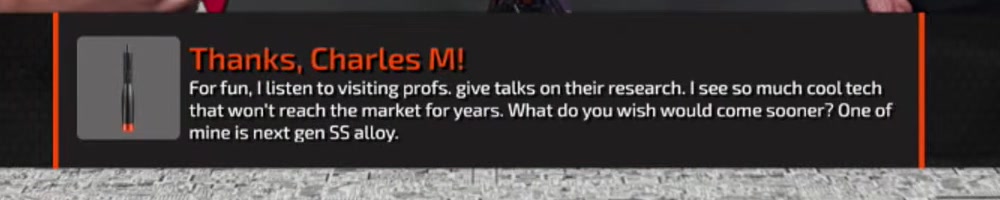 Charles M message Thanks, Charles M! For fun, I listen to visiting profs. give talks on their research. I see so much cool tech that won't reach the market for years. What do you wish would come sooner? One of mine is next gen SS alloy. Timestamp