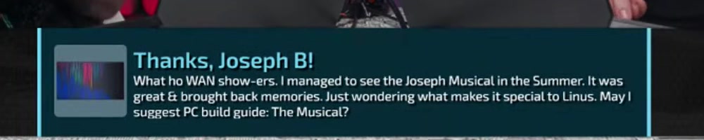 Joseph B message Thanks, Joseph B! What ho WAN show-ers. I managed to see the Joseph Musical in the Summer. It was great & brought back memories. Just wondering what makes it special to Linus. May I suggest PC build guide: The Musical? Timestamp