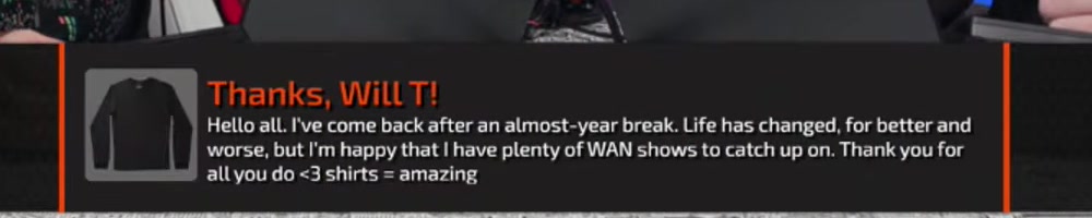 Will T message Thanks, Will T! Hello all. I've come back after an almost-year break. Life has changed, for better and worse, but I'm happy that I have plenty of WAN shows to catch up on. Thank you for all you do <3 shirts = amazing Timestamp