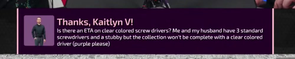 Kaitlyn V message Thanks, Kaitlyn V! Is there an ETA on clear colored screw drivers? Me and my husband have 3 standard screwdrivers and a stubby but the collection won't be complete with a clear colored driver (purple please) Timestamp