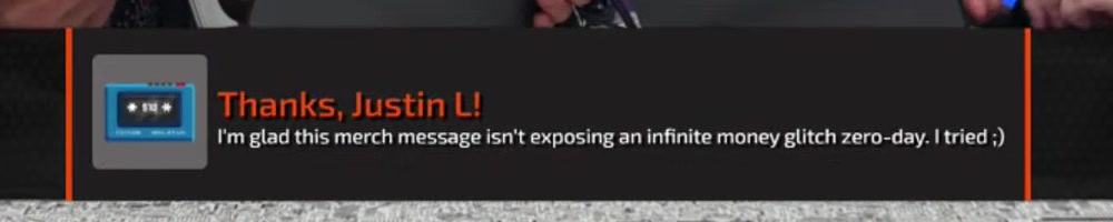 Justin L message Thanks, Justin L! I'm glad this merch message isn't exposing an infinite money glitch zero-day. I tried ;) Timestamp